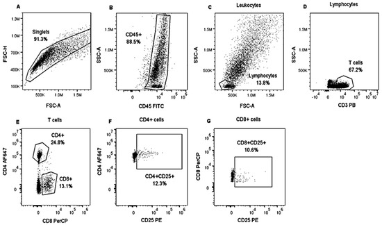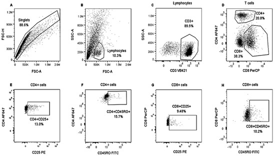 The antibodies used in this study are listed in Table 1. Two panels were designed to identify leukocytes (CD45+), T lymphocytes (CD3+), helper T lymphocytes (CD4+), cytotoxic T lymphocytes (CD8+), activated T lymphocytes (CD25+), and memory cells (CD45RO+).