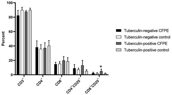 Panel 1, which was used in the 3-day cultures, showed a proportion of T lymphocytes between 82 and 90% in control and CFPE-stimulated cultures of tuberculin-positive and -negative animals. There was no difference in the CD4+ population between tuberculin-positive and -negative animals. Tuberculin-positive cattle had higher numbers of CD8+ and CD4+CD25+ cells after stimulation with CFPE, although this was not significant. However, there was a significant increase in CD8+CD25+ cells from CFPE-stimulated tuberculin-positive heifers compared to the unstimulated control (p < 0.05) (Figure 3).