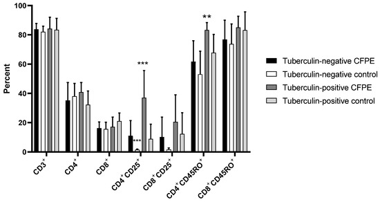 Panel 2, which was used in 9-day cultures, showed a proportion of 82–84% CD3+ cells in tuberculin-positive and -negative animals, both in control and CFPE-stimulated cultures. There was no difference in CD4+, CD8+, CD8+CD25+, and CD8+CD45RO+ populations between groups. CFPE-stimulated PBMCs from the tuberculin-positive group showed a significantly higher proportion of CD4+CD25+ cells (37%) than the unstimulated control and the tuberculin-negative groups (both stimulated and unstimulated) (p < 0.001). Regarding CD4+CD45RO+ memory cells, there was a significant difference (p < 0.01) between the stimulated tuberculin-positive group (85%) and the tuberculin-negative control animals (74%) (Figure 4).