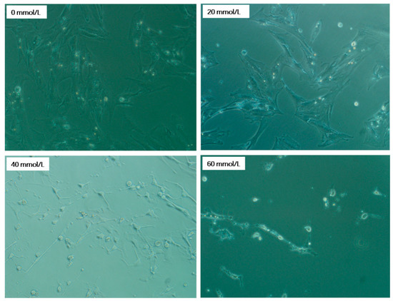 We randomly selected five regions to obtain the cell morphology results. As shown in Figure 1, the granulosa cells of the control group were fusiform or irregularly polygonal, fully stretched, tightly arranged, translucent, and displayed adequate adhesion. The cells displayed dendritic connections with an increase in the mass concentration of 2,5-HD (24 h, 40 mmol/L). When the concentration of 2,5-HD was increased to a certain degree (24 h, 60 mmol/L), the pGCs grew spherically, and some cells were detached and suspended.