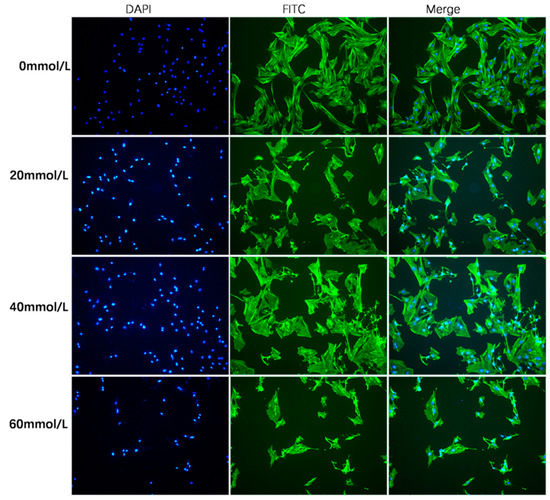 The pGCs were inoculated in a 12-well plate and allowed to attach for 12 h. Cells were then treated with 2,5-HD media (0 mmol/L, 20 mmol/L, 40 mmol/L, 60 mmol/L) at 37 °C for 24 h. After about 45 min of incubation at room temperature in a dark area, an antifade substance containing fluorescein isothiocyanate (FITC) was injected into the cells, which were then rinsed with PBS for 10 min. FITC-phalloidin (Solarbio CA1620, Beijing, China) was added for 30 min of re-staining, followed by 10 μL of anti-fluorescence quenching tablets containing 4′,6-diamidino 2-phenylindole (DAPI) to obtain FITC-phalloidin-labeled cytoskeleton and DAPI-labeled cellular nuclei. Finally, a fluorescent microscope (Leica Microsystems DM2500, GER) was used to view the cells.