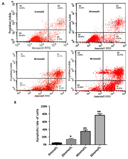 Figure 3. pGC apoptosis detection. (A) Effects of different concentrations of 2,5-HD (0 mmol/L, 20 mmol/L, 40 mmol/L, and 60 mmol/L) for 24 h on pGC apoptosis by flow cytometry. (B) Effects of different concentrations of 2,5-HD (0 mmol/L, 20 mmol/L, 40 mmol/L and 60 mmol/L) for 24 h on pGC apoptosis. Compared to the control group, n = 3, * p < 0.05, ** p < 0.01. All experiments were repeated 3 times.