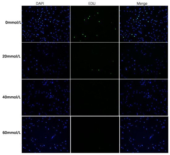 EDU (5-ethynyl-2′-deoxyuridine) staining enables quick and effective cell proliferation assays to accurately measure the proportion of cells in the S phase. Therefore, using EDU staining in accordance with the manufacturer’s instructions, the proliferation of pGCs was determined. After treatment with 0 mmol/L, 20 mmol/L, 40 mmol/L, and 60 mmol/L 2,5-HD for 24 h, cells were cultured in phenol red-free DMEM/F12 with 50 μM EdU (RiboBio, Guangzhou, China) staining for 2 h [23,24]. Cells were then rinsed two times with 0.02 M PBS (pH = 7.2) at 5-min intervals before being immobilized for 30 min with 4% paraformaldehyde (Biosharp, Hefei, China). Following that, cells were treated for 5 min with glycine (Biosharp, Hefei, China) (2 mg/mL) and rinsed for 5 min with PBS [23,24]. After 30 min of DAPI (0.5 μg/mL) (Biosharp, Hefei, China) staining [23], three rounds of PBS washing were conducted at 5-min intervals. Lastly, a Leica DM4000 BLED microscope (Leica Microsystems DM2500, GER) was used to observe the fluorescence in cells.