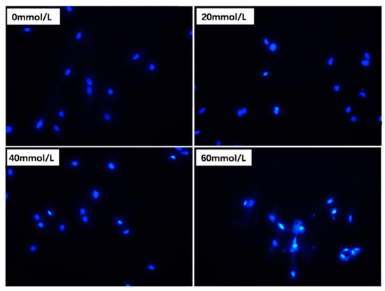 Cellular and chromatin ultrastructures that have been maintained well can be stained with EDU to identify cell proliferation. We randomly selected five regions to obtain the staining results. Images were first captured, and the results obtained with the images were used to perform a difference analysis. As shown in Figure 4, the percentage of EDU-positive cells was significantly lower in the 2,5-HD-treated group (20 mmol/L, 24 h) than in the control group (p < 0.01). Proliferation-free cells were discovered in the randomly selected fields of the 40 mmol/L (24 h) group and the 60 mmol/L (24 h) group. These results demonstrated that a 40 mmol/L (24 h) 2,5-HD treatment inhibited the proliferation of pGCs. After pGCs were exposed to 2,5-HD, chromatin condensation and a larger nucleus were discovered, as shown in Figure 5 by DAPI staining.