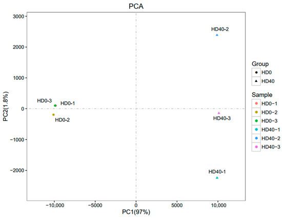 Figure 6. Principal component analysis (PCA) of samples’ relationship. The control groups (HD0-1,2,3) are represented by the triangle nodes, while the 2,5-HD treated groups (HD40-1,2,3) are represented by the circle nodes. The two principal components, PC1 and PC2, together accounted for 98.8% of the total variance, with PC1 accounting for 97% and PC2 for 1.8%.