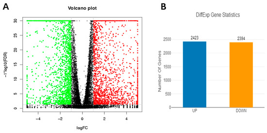 Figure 7. The identification of differentially expressed genes (DEGs). (A) DEGs with higher (H) and lower (L) levels are displayed on the volcano plot. Genes that differ significantly are represented by red and green points, respectively, with a fold change |log2FC| >1 and FDR < 0.05. Genes with a fold change |log2FC| ≤ 1 and no significant difference are represented by black points; red and green points denote up-regulated and down-regulated genes, respectively. (B) Higher (H) and lower (L) levels of DEG statistics. Down-regulated and up-regulated genes are represented on the X-axis, while the number of DEGs is represented on the Y-axis.