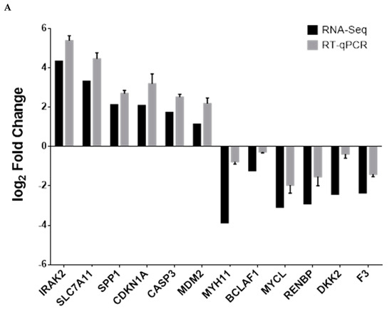 According to the DEGs discovered in the 2,5-HD (0 mmol/L and 40 mmol/L for 24 h) treatment group of pGCs, gene and pathway analyses were conducted. A total of 22,955 genes were obtained from the RNA-seq results by comparing them to the reference genome from Scrofa11.1 of Ensembl (http://www.ensembl.org/, accessed on 16 October 2022). The significant DEGs’ relative transcription levels were shown by a fold change |log2FC| > 1 and FDR < 0.05 (Figure 7A); a fold change |log2FC| ≤ 1 and FDR ≥ 0.05 was regarded as insignificant. Nonetheless, the analysis showed up to 4817 DEGs (Table S1). Of these, 2423 were up-regulated, while 2394 were down-regulated (Figure 7B).To verify the reliability of sequencing data, six genes (IRAK2, SLC7A11, SPP1, CDKN1A, CASP3 and MDM2) that were significantly up-regulated in the treatment group (2,5-HD 40 mmol/L, 24 h) and six genes (MYCL, RENBP, DKK2, F3, MYH11 and BCLAF1) that were significantly down-regulated in the normal control group (2,5-HD 0 mmol/L, 24 h) were randomly selected for RT-qPCR verification. These qRT-PCR results aligned with the sequencing results, indicating the reliability of RNA-Seq data (Table 5 and Figure 8).