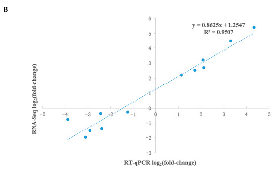 Quantitative real-time PCR was used as proof that high-throughput sequencing was accurate. To detect the expression trend of the sequencing results, 12 genes were chosen at random. TRIzol reagent (Invitrogen Corporation, Carlsbad, CA, USA) was used to extract the cells’ total RNA, and the Primer-Script RT reagent Kit (TaKara, Tokyo, Japan) was used to reverse-transcribe the extracted total RNA into cDNA. The CFX96 Touch Real-Time PCR Detection System (Bio-Rad, Hercules, CA, USA) was used for qRT-PCR analysis. Based on sequence data of the NCBI database (www.ncbi.nlm.nih.gov/genbank, accessed on 20 November 2022), the specific primers utilized for RT-PCR were designed or modified by Primer Premier 6.0 software (Premier Biosoft International, Palo Alto, CA, USA) [26] and are listed in Table 2. The thermal cycling program consisted of 95 °C for 30 s, followed by 40 cycles at 95 °C for 5 s and 60 °C for 30 s. The housekeeping gene glyceraldehyde-3-phophate dehydrogenase (GAPDH) was used to standardize the expression levels of the genes, and the changes in relative gene expression were computed by the 2−ΔΔCt method. Significant differences were evaluated by Student’s t-test using SAS software (version 9.0), and a value of p < 0.05 was considered to be significant, which was calculated at least three times from independent biological replicates.