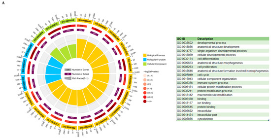 For a more in-depth view of the identified DEGs, we conducted GO and KEGG pathway enrichment analyses. The three GO categories—biological process, cellular component, and molecular function—were used to group together all of the GO terms associated with DEGs. The results of the enriched analysis revealed that, for the biological process, cellular component, and molecular function categories, 67, 26, and 13 GO terms were significantly enriched (p < 0.05) (Table S2), respectively. The DEGs were mainly involved in different developmental processes, including intracellular, organelle, and binding. The top 20 enriched GO terms are shown in Figure 9A, which demonstrates that the majority of the biological process are linked to cell activity, such as the cell cycle (Tables S2 and S3). In KEGG enrichment, we found the p53 signal pathway was one of the important metabolic pathways with the smallest Q value (Q value= p-value following corrections from multiple hypothesis tests) (Figure 9B and Tables S4 and S5). The activation of the p53 signaling pathway is mainly induced by DNA damage, oxidative stress, and oncogene expression and plays a positive role in promoting cell apoptosis, regulating the cell cycle, and preventing tumorigenesis [31]. Moreover, the PI3K/Akt signaling pathway, with its ovarian-relevant functions of the recruitment of primordial follicles, the proliferation of granulosa cells (GCs), the formation of the corpus luteum, and oocyte maturation [32], was also significantly enriched (Q value < 0.05) (Figure 9B and Table S6).
