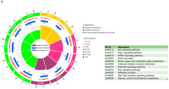 Figure 9. Function enrichment analysis of transcriptomic data. (A) Top 20 enriched GO terms of the DEGs. The first lap indicates the top 20 GO terms, and the number of the genes corresponds to the outer lap. The second lap indicates the number of genes in the genome background and p-value for enrichment of the differentially expressed genes (DEGs) for the specified biological process. The third lap indicates the DEG number. The fourth lap indicates the rich factor of each GO term. (B) Significantly enriched KEGG pathways from differentially expressed genes (DEGs). The first lap represents the significantly enriched pathways’ ID, and the number of genes corresponds to the outer lap. The second lap represents the number of genes in the genome background as well as the Q-value for pathways. The third lap represents the DEG number. The fourth lap shows the rich factor of each KEGG pathway. P-value < 0.05 and Q value < 0.05 were considered significant in GO and KEGG analyses, respectively.