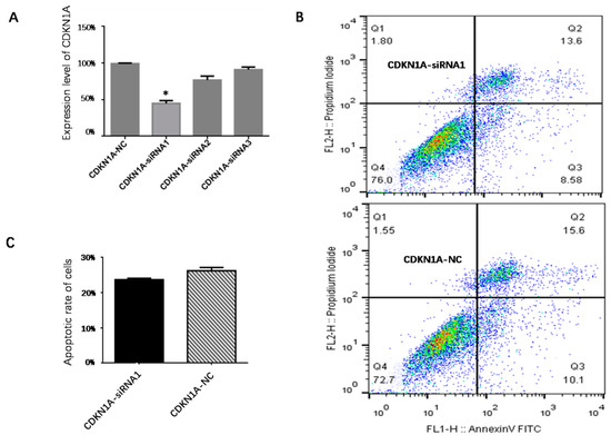 Figure 10. (A) Quantification map of transfection efficiency, * p < 0.05. (B) Effects of CDKN1A-siRNA1 and CDKN1A-NC on pGC apoptosis by flow cytometry after transfection. (C) Quantitative histogram of the apoptotic rate after transfection of CDKN1A-siRNA1 and CDKN1A-NC on pGC apoptosis. All experiments were repeated 3 times.