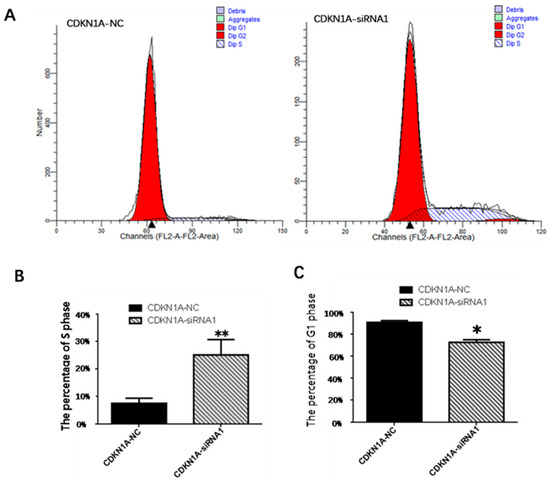 Figure 11. (A) Cell cycle analysis of pGCs after transfection of CDKN1A-siRNA1 and CDKN1A-NC. (B) Quantification of the S phase by flow cytometry after transfection. (C) Quantification of the G1 phase by flow cytometry after transfection, * p < 0.05, ** p < 0.01. All experiments were repeated 3 times.