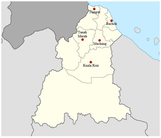 Figure 1. Map of Kelantan, Malaysia with five red circles showing locations of five sampling areas.