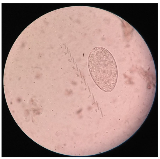 For the detection of Fasciola spp. eggs, faecal samples were subjected to the formalin-ether sedimentation technique [4]. A light microscope with an eyepiece reticle was used to examine the sediment at 100× and 400× magnification (Zeiss, Germany). The egg of Fasciola spp. was identified using the morphology described in a previous study [15,16]. Eggs of Fasciola spp. were golden in colour, ellipsoidal, operculated, and measured 130–150 µm long by 60–90 µm wide (Figure 2). The presence of Fasciola spp. eggs in the faecal samples was used to interpret a positive result for Fasciola spp. infestation. The McMaster egg-counting technique was applied to positive samples to determine the number of EPG. The load of infestation was categorized into three levels, i.e., mild infestation (1–500 EPG), moderate infestation (501–1000 EPG), and severe infestation (above 1000 EPG) [17].