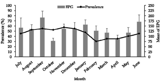 Investigating the seasonal occurrence of cattle fascioliasis is important to improve understanding of the seasonal pattern of the disease. The present study is the first to determine seasonal occurrence of cattle fascioliasis in Kelantan and its correlation with climatic factors. The overall estimated prevalence of cattle fascioliasis in this study was 45.8%, higher than the previous cross-sectional surveillance of cattle fascioliasis in Kelantan, which reported an overall prevalence of 14.6% based on coprological examination of the Fasciola eggs [13]. The high prevalence of cattle fascioliasis may be due to irregular anthelmintic treatment in the investigated areas. In addition, most of the farms were in rural areas located near the river, which is the main source of the cattle’s drinking water [13]. The monthly average EPG trends showed the prevalence peaked in November 2018, which coincided with the wet season that could support the survival of metacercarial cyst for ingestion during grazing.
