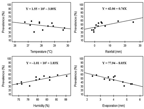 Figure 4. Scatter plot depicting the correlations between cattle fascioliasis and temperature (°C), rainfall (mm), humidity (%), and evaporation (mm).