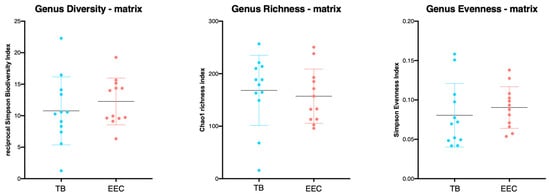 The non-metric multidimensional scaling (NMDS) graph showed no significant clustering between the EEC and TB of the experimental Beagle dogs by using AMOVA analysis with the taxonomic approach (Bray-Curtis). (Figure 3).