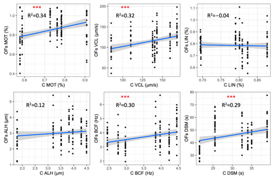 3.3. Correlation among the Post-Thaw Sperm Motility Parameters Activated in Ovarian Fluid and Control Activation Solution