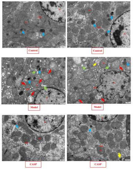 In the normal control group, the morphology and structure of the hepatocytes in the chicken liver were normal, the structure of the organelles in the cytoplasm was complete and clear, no obvious lesions were found, and a small amount of primary lysosomes were occasionally seen. In the model group, the liver nuclei in the chicken liver were mostly irregular, with chromatin aggregation. Most of the rough endoplasmic reticulum in the cytoplasm had expanded, a large number of mitochondria have obvious swelling (crista dissolution and fracture), and a large number of primary lysosomes and obvious autophagy could also be seen. It could be found that after modeling with CS and LPS, chicken hepatocytes had significant pathological changes, the endoplasmic reticulum and mitochondria have been damaged, and autophagic bodies have appeared, which confirms that autophagy is indeed involved in the pathological process of liver injury caused by CS and LPS. The chicken liver morphology and structure of liver cells in the intervention group of CASP were similar to that in the normal control group, only a small amount of autophagy was found in the cytoplasm. It could be found that CASP had a good intervention effect on the pathological process of chicken liver injury caused by CS and LPS.