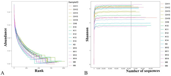 Analysis of uniformity and richness of species in samples. Note: (A) Rank abundance curve; (B) Shannon curves; K refers to the normal control group, CH refers to the CASP intervention group, and M refers to the model group. The same as below.