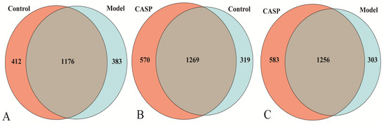 Venn diagram of OTUs distribution in each group. Note: (A) OTUs Venn diagram of the normal control group and the model group; (B) OTUs Venn diagram of the normal control group and the intervention group of CASP; (C) OTUs Venn diagram of the model group and the intervention group of CASP.