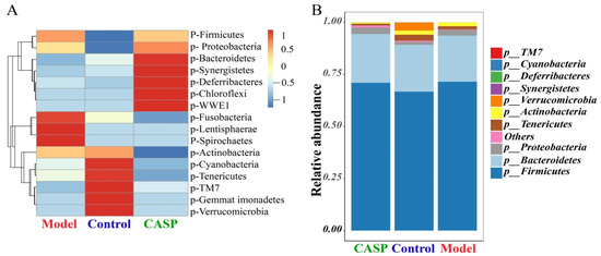 The distribution of intestinal floras at the phylum level of each group is shown in Figure 5. At the phylum level, the richness of Bacteroidetes, Synergistetes, Deferribacteres, Chloroflexi, and WWE1 in the intervention group of CASP was higher, and the richness of Actinobacteria was significantly lower (p < 0.05). In the model group, Fusobacteria, Lentisphaerae, and Spirochaetes had higher richness. In the normal control group, Cyanobacteria, Tenericutes, Gemmatimonadetes, TM7, and Verrucomicrobia had higher richness (Figure 5A). Firmicutes, Bacteroidetes, and Proteobacteria were the dominant floras in the cecum contents (Figure 5B).