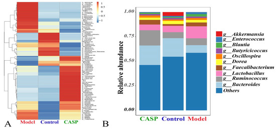 The distribution of intestinal floras of each group at the genus level is shown in Figure 6. At the genus level, the richness of Lachnospira, Acinetobacter, Coprococcus, Adlercreutzia, Ruminococcus, Prevotella, Novispirillu, Syntrophomonas, Micrococcus, Cupriavidu, HA73, W22, Succinatimonas, Pelobacter, Sphingobacterium, Syntrophus, T78, Allobaculum, Spirosoma, Herbaspirillum, Asticcacaulis, Mucispirillum, Rubrivivax, Caulobacter, Burkholderia, Sphingomonas, Ralstonia, Sutterella, Paraprevotella, Faecalibacterium, Oscillospira, Gallibacterium, and Novosphingobium in the intervention group of CASP was higher. In the model group, the richness of Sporosarcina, Victivallis, Actinomyces, Haemophilus, Macrococcus, Treponema, Helicobacter, SMB53, Geobacillus, Lactobacillus, Proteus, Anoxybacillus, Bubacterium, Escherichia, Anaerotruncus, Blautia, Streptococcus, Enterococcus, Fusobacterium, Clostridium, Lactococcus, Veillonella, Staphylococcus, AF12, and Corynebacterium were higher. In the normal control group, the richness of Facklamia, Candidatus Arthromitus, Akkermansia, DA101, Brevibacterium, Luteimonas, Dehalobacterium, Bacillus, Jeotgalicoccus, Bifidobacterium, Granulicatella, Rhodococcus, Butyricicoccus, Turicibacter, Pseudoramibacter, Eubacterium, Anaerofustis, and Microbacterium were higher (Figure 6A). At the genus level, Bacteroides, Ruminococcus, and Lactobacillus were the top three dominant floras (Figure 6B).