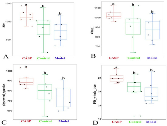 The α-diversity analysis results of cecum content floras in each group (Figure 7) showed that compared with the normal control group, the ace, chao1, observed species, and PD whole tree indexes of cecum floras in liver injury chicken decreased, and the differences were not significant, prompting that the biodiversity of intestinal floras would be reduced when the antibiotics were used. Compared with the model group, the ace, chao1, observed species, and PD whole tree indexes of chicken cecum floras in the intervention group of CASP were significantly increased (p < 0.05).