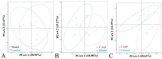 Principal coordinate analysis of cecum content floras in each group. Note: (A) PCoA diagram of the normal control group and the model group; (B) PCoA diagram of the model group and the intervention group of CASP; (C) PCoA diagram of the normal control group and the intervention group of CASP.