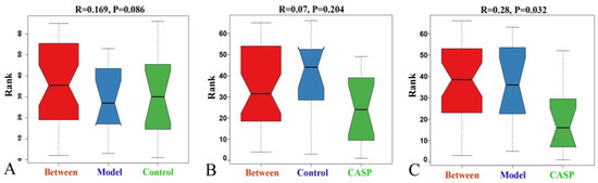 Anosim analysis of cecum content floras in each group. Note: (A) Anosim analysis diagram of the normal control group and the model group; (B) Anosim analysis diagram of the normal control group and the intervention group of CASP; (C) Anosim analysis diagram of the model group and the intervention group of CASP.