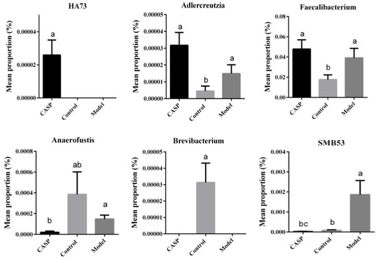 At the genus level, the abundances of Adlercreutzia and Faecalibacterium in the intervention group of CASP were significantly higher than those in the normal control group, and the abundance of HA73 was significantly higher than that in the normal control group and the model group (p < 0.05). The abundance of SMB53 in the intervention group of CASP was significantly lower than that in the normal control group and model group (p < 0.05), the abundance of Brevibacterium was significantly lower than that of the normal control group (p < 0.05), and the abundance of Anaerofustis was significantly lower than that of the model group (p < 0.05).