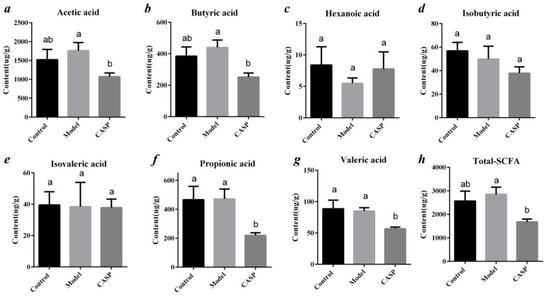 As shown in Figure 12, the contents of acetic acid, butyric acid, and total SCFAs in the intervention group of CASP were significantly lower than those in the model group (p < 0.05), and the contents of propionic acid and valeric acid were significantly lower than those in model group (p < 0.05) and normal control group (p < 0.05).