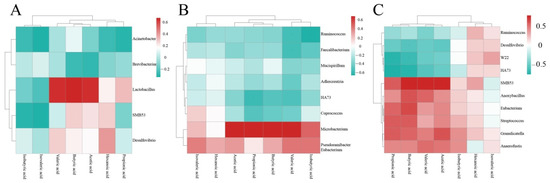 Heatmap of SCFAs and intestinal floras of chicken cecum contents of different groups. Note: (A) Cluster heatmap of SCFAs and intestinal floras in the normal control group and the model group; (B) Cluster heatmap of SCFAs and intestinal floras in the normal control group and the intervention group of CASP; (C) Cluster heatmap of SCFAs and intestinal floras in the model group and the intervention group of CASP.