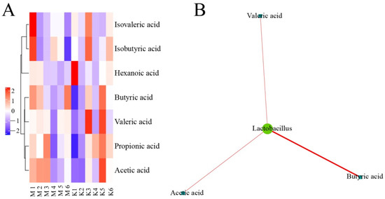 As shown in Figure 14, Lactobacillus was positively correlated with the production of valeric acid, acetic acid, and butyric acid in the normal control group and the model group.