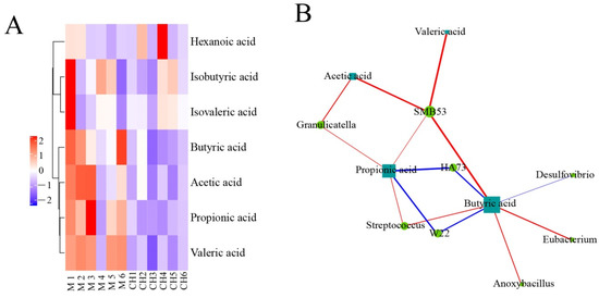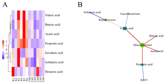 Correlation analysis of intestinal floras and SCFAs in chicken cecum contents between the normal control group and the intervention group of CASP. Note: (A) Cluster heatmap of SCFAs between the normal control group and the intervention group of CASP; (B) Network of intestinal floras and SCFAs between the normal control group and the intervention group of CASP. The red and blue line represents positive and negative correlation, respectively. The same as below.