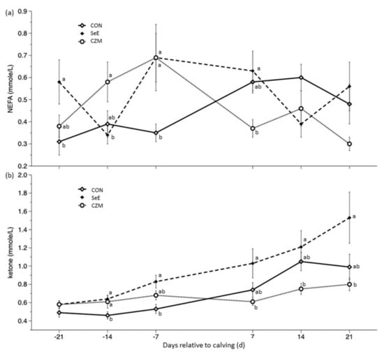 Effects of Se-vitamin E (SeE) or Cu-Zn-Mn (CZM) supplementation on (a) NEFA (time p = 0.13, treat × time p < 0.001) and (b) blood ketone (time p < 0.001, treat × time p < 0.01) changes from 21 days prepartum to 21 days postpartum in transition dairy cows. CON: fed a basal diet without supplementation, n = 8; SeE: supplemented with 1500 IU vitamin E and 0.3 ppm of organic Se, n = 8; CZM: supplemented with 12.5 ppm of organic Zn, 5 ppm of organic Cu, and 7.5 ppm Mn, n = 8. Values are means ± standard error of mean. a,b, Values within the same time point with different superscripts differ significantly (p < 0.05).