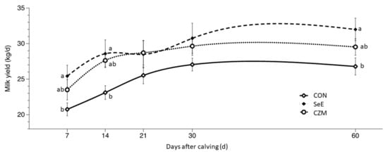 The greatest proportion of postpartum disorders fell into the CON group since no preventive measure was offered for both inflammatory and metabolic transition diseases. Both inflammatory and metabolic transition diseases are associated with increased NEFA [43]. SeE supplementation in the pre-calving period can increase immune responses, and antioxidant capacity after parturition and reduce mastitis and RFM in dairy cows, low SCC, and enhance mammary health [38,44]. RFM decreased feed intake which in turn lowered milk yield [45]. In this study, the significantly lower incidence of RFM, and greater milk yield in SeE cows at d60, BHBA, and NEFA were higher than CON at some time point. These results showed that supplementing SeE could reduce inflammation in transition dairy cattle and prevent RFM which indirectly had a positive influence on milk production and reproduction performance, but it did not help improve energy balance. Substantial evidence exists that trace minerals such as Zn, Cu, and Mn can minimize the negative effects of oxidative state [46]. Higher rates of metritis, mastitis, and RFM were declared to be associated with lower Zn nutritional status [47]. SCLS in CZM was significantly lower than CON at d14 (Table 6). In addition, SCLS in CZM tended to be lower at d30 and d60 (p < 0.1).