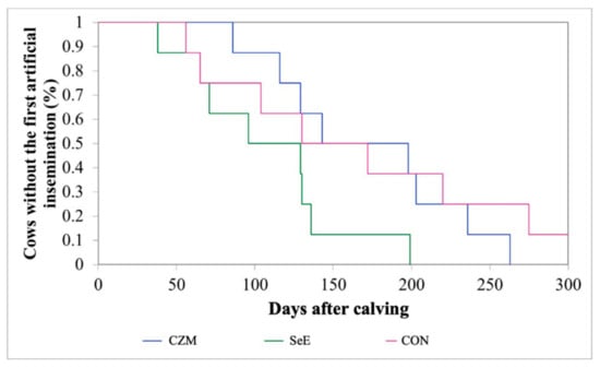Kaplan–Meier survival analysis of the first artificial insemination (%) over a period of 300 days from calving in this study. CZM: supplemented with 12.5 ppm of organic Zn, 5 ppm of organic Cu, and 7.5 ppm Mn, n = 8; SeE: supplemented with 1500 IU vitamin E and 0.3 ppm of organic Se, n = 8; CON: fed a basal diet without supplementation, n = 8. The p-values between the groups were 0.49 for CON and CZM, 0.01 for CON and SeE, and 0.003 for SeE and CZM.