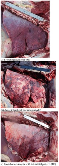 Right-sided view of gross lesion characteristics representing the three main gross pulmonary pathological diagnoses in this study: (a) bronchopneumonia (BP), (b) acute interstitial pneumonia (AIP), and (c) bronchopneumonia with an interstitial pneumonia (BIP).