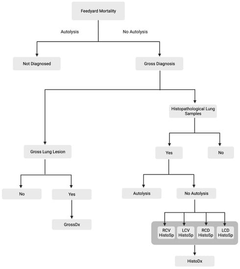 Case inclusion strategy to determine feedyard mortalities evaluated for pulmonary lesions by either gross diagnosis (GrossDx) or histopathological diagnosis (HistoDx). Four lung samples were taken from a subset of cases for histopathology. Samples were acquired from the right cranioventral (RCV), left cranioventral (LCV), right caudodorsal (RCD), and left caudodorsal (LCD) lung lobes.