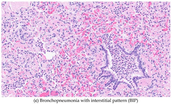 Photomicrograph examples from individual cases diagnosed with bronchopneumonia (BP) (a); acute interstitial pneumonia (AIP) (b); bronchopneumonia with interstitial pattern (BIP) (c).