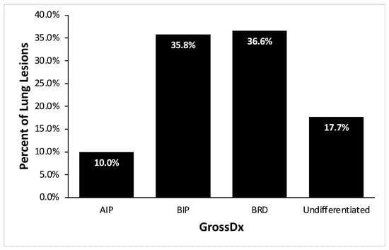 Of the 402 cattle with gross necropsy results, 359 cases showed gross lung lesions (89%). The remaining forty-three cases were not evaluated due to the absence of a lung lesion. Of the 402 cases that were grossly diagnosed, 36.6% (147/402) were classified with BP, 10.0% (40/402) with AIP and 35.8% (144/402) were classified with BIP (Figure 4). The remainder of the cases were categorized in the Undifferentiated category, including healthy lungs (17.7%; 71/402).