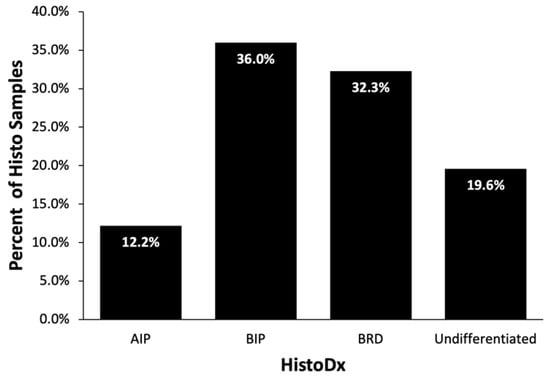 Similar to the distribution of GrossDx, BIP lesions accounted for 36.0% (68/189) of the lung HistoDx. BP followed with 32.3% (61/189) and AIP was classified in 12.2% (23/189) of the HistoDx. Respiratory lesions that did not fit the above three categories or healthy lungs were categorized as Undifferentiated (19.6%; 37/189) (Figure 5).
