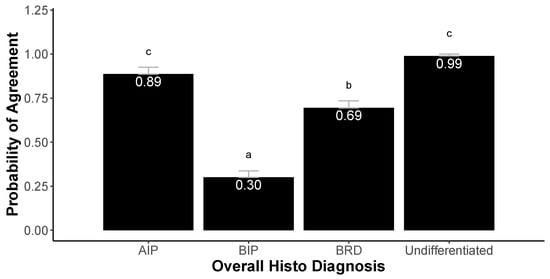 Probability of agreement between histopathological sample (HistoSp) diagnosis with overall case diagnosis (HistoDx) from feedyard necropsies on 172 cases. Results generated from generalized linear model with random effects for individual feedyard (n = 6) and case number (4 HistoSp per case). Differing superscript letters illustrate statistical differences (p < 0.05) in probability of agreement among HistoDx.