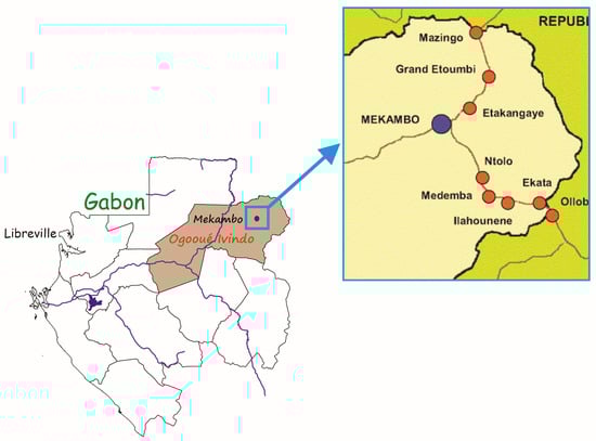 - Binot, A.; Cornélis, D. Synthèse Bibliographique du Secteur ‘Viandes de Brousse’ au Gabon, Rapport Final; Rapport Cirad-Emvt N° 04-14; CIRAD: Montpellier, France, 2004; pp. 1–106. Available online: https://agritrop.cirad.fr/520619/1/document_520619.pdf (accessed on 5 November 2022).