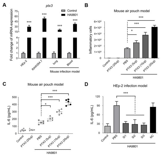 Our previous studies have identified that the PTX3 protein is involved in the infection of S. suis [,], though its underlying roles are still not fully understood. In this study, we found that the transcription of gene PTX3 was significantly upregulated (more than a 30-fold change) by the infection of SS2 strain HA9801 on Raw264.7 and Hep2 cells (Figure 1A). In the mouse systemic infection model, the challenge of strain HA9801 caused a huge transcriptional activation of PTX3 in the blood and lungs. These results indicated that host cells recruit and deploy a mass of PTX3 proteins during SS2 infection, which may play vital roles in resisting the invasion by bacterial pathogens. Indeed, PTX3 has been identified as a part of the innate immune system and is one of the acute-phase proteins that perform various functions, such as modulating inflammation, repairing tissue and recruiting immune cells []. To investigate the role of PTX3 in the innate immune response during the SS2 infection, a mouse air pouch model was established that assessed the changes in inflammatory levels. As shown in Figure 1B, the supplements of exogenous PTX3 caused significant increases in inflammatory cells in a dose-dependent manner during the infection with SS2 strain HA9801. Similar activations mediated by the exogenous PTX3 were also observed on the IL-6 levels that the air pouch exudates after 5 h of HA9801 infection (Figure 1C). However, neither the supplements of PTX3 nor the HA9801 infection alone could not cause the above phenotypes, suggesting that the inflammatory response may be coordinately regulated by the PTX3 and bacterial infection. To further verify the role of PTX3 in inflammatory modification, we silenced the native PTX3 expression with the specific siRNAs on the Hep2 cells. The results of IL-6 levels showed that knockdown of PTX3 almost completely abolished the activation of the inflammatory response induced by the HA9801 infection (Figure 1D), compared with the cells transfected with the non-specific siRNA (SiNC) and incubated with the PBS control. Overall, our data indicated that PTX3 protein significantly stimulates the host inflammatory response during S. suis infection.