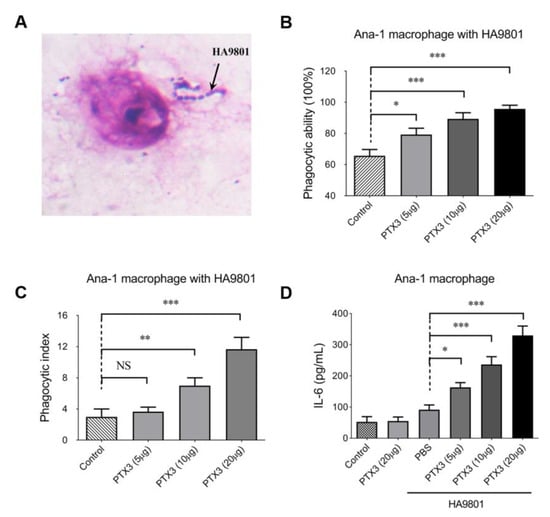 PTX3 enhanced the phagocytosis of mouse macrophage Ana-1 in strain HA9801. (A) The observation of Ana-1 swallowing HA9801 stained with Giemsa by microscope (10 × 100). The phagocytic ability (B) and phagocytic index (C) of macrophage Ana-1 to SS2 strain HA9801 were assessed under the treatment of different doses of PTX3 protein (5, 10, 20 μg). Phagocytic ability was defined as the percentage of Ana-1 cells that trapped bacterial cells of strain HA9801; phagocytic index was defined as the average quantity of bacterial cells swallowed by each Ana-1. (D) The levels of the cytokine IL-6 were detected under the treatment of PTX3 protein (5, 10 and 20 μg) during the HA9801 infection. Data were shown as the mean ± SEM of three independent experiments performed in triplicate. Statistical significance was determined by a Student’s t-test based on comparisons with the PBS group (ns, p > 0.05; * p < 0.05; ** p < 0.01; *** p < 0.001).