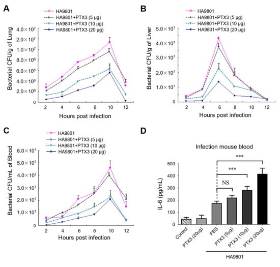 PTX3 significantly reduced the bacterial load in the organs during the HA9801 infection. Bacterial loads in mouse lung (A), liver (B), and blood (C) were detected from 2 to 12 h post-infection, with or without the co-treatment of PTX3 (5, 10 or 20 μg). (D) The levels of IL-6 in the HA9801-infected bloods with the co-treatment of PTX3 (5, 10 or 20 μg). Data were shown as the mean ± SEM of three independent experiments performed in triplicate. Statistical significance was determined by a Student’s t-test based on comparisons with the PBS group (*** p < 0.001).