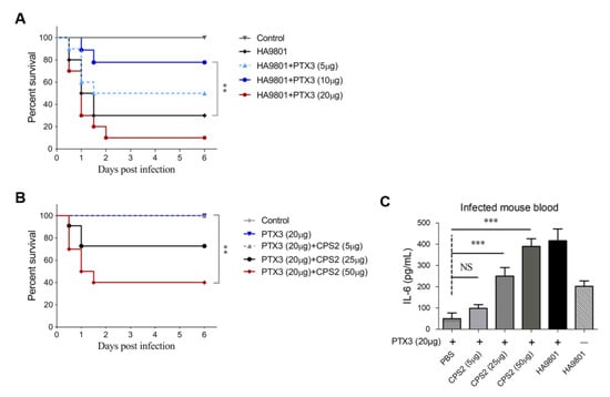 Challenge the protections of PTX3 and CPS2 in mice. (A) Survival curves of mice infected by the HA9801 strain with the co-treatment of PTX3 (5, 10 or 20 μg). (B) Survival curves of mice co-treated by PTX3 (20 μg) and CPS2 extraction (5, 25 or 25 μg). (C) The levels of IL-6 in the bloods of mice co-treated by PTX3 (20 μg) and CPS2 extractions (5, 25 or 50 μg). The Log-rank (Mantel–-Cox) test was used to analyze the survival curve in the animal experiments. A two-tailed unpaired t test was used for the rest of the experiments. For all tests, a p value < 0.05 was considered statistically significant (** p < 0.01, *** p < 0.001), and all the data were shown as mean ± SEM.