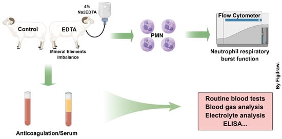 This study established a model of mineral element homeostatic imbalance and examined the respiratory burst function of peripheral blood neutrophils and inflammatory and antioxidant indicators before and after the imbalance in sheep. The results showed that after an EDTA injection, the number of activated neutrophils in the peripheral blood was significantly higher than that in the control group (p < 0.01). In addition, the serum IL-6 level was significantly increased (p < 0.05) and matrix metalloproteinase 7 (MMP7) was inhibited (p < 0.05), but returned to a normal level one week after the injection. Tissue inhibitor of metalloproteinase 1 (TIMP1) levels were consistently higher after the injection and significantly higher than in the control group (p < 0.05). CuZn-SOD, TNOS activity, serum creatinine and urea nitrogen levels were significantly higher than before the injection (p < 0.05). Combining the results of previous studies, the EDTA injection altered the metabolism and transcription of peripheral blood neutrophils. These changes enhance the respiratory burst function of neutrophils and alter the status of inflammatory and antioxidant indicators such as IL-6 and CuZn-SOD.